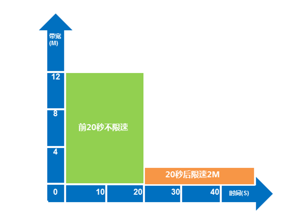 ●通(tōng)過NetMizer的(de)延時(shí)限速功能(néng),實現(xiàn)在保證用(yòng)戶測速軟件(jiàn)及測速網站(zhàn)準确₽性的(de)同時(shí),對(duì)用(yòng)戶下(xià)載也(yě)進行(xíng)了(le)限速。€如(rú)下(xià)圖所示,在網絡測速時(shí)間(jiān)內(nèi)不(bù)對(duì)用(yòng)戶帶寬做(zuò)限速,當₽超過測速時(shí)間(jiān)後,嚴格限制(zhì)用(yòng)戶帶寬。如(rú)下(xià)圖所示,為(wèi)延時♥(shí)限速示意圖: